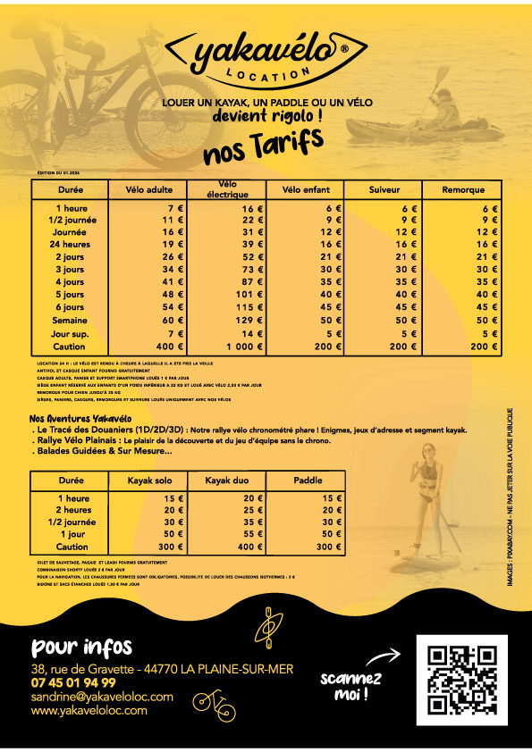 Depuis 2023 à La-Plaine-sur-Mer, Sandrine propose à la location des vélos électriques, des vélos traditionnels pour adulte et enfant, des remorques enfants, des portes bébés… Idéal pour des balades en famille ou entre amis.